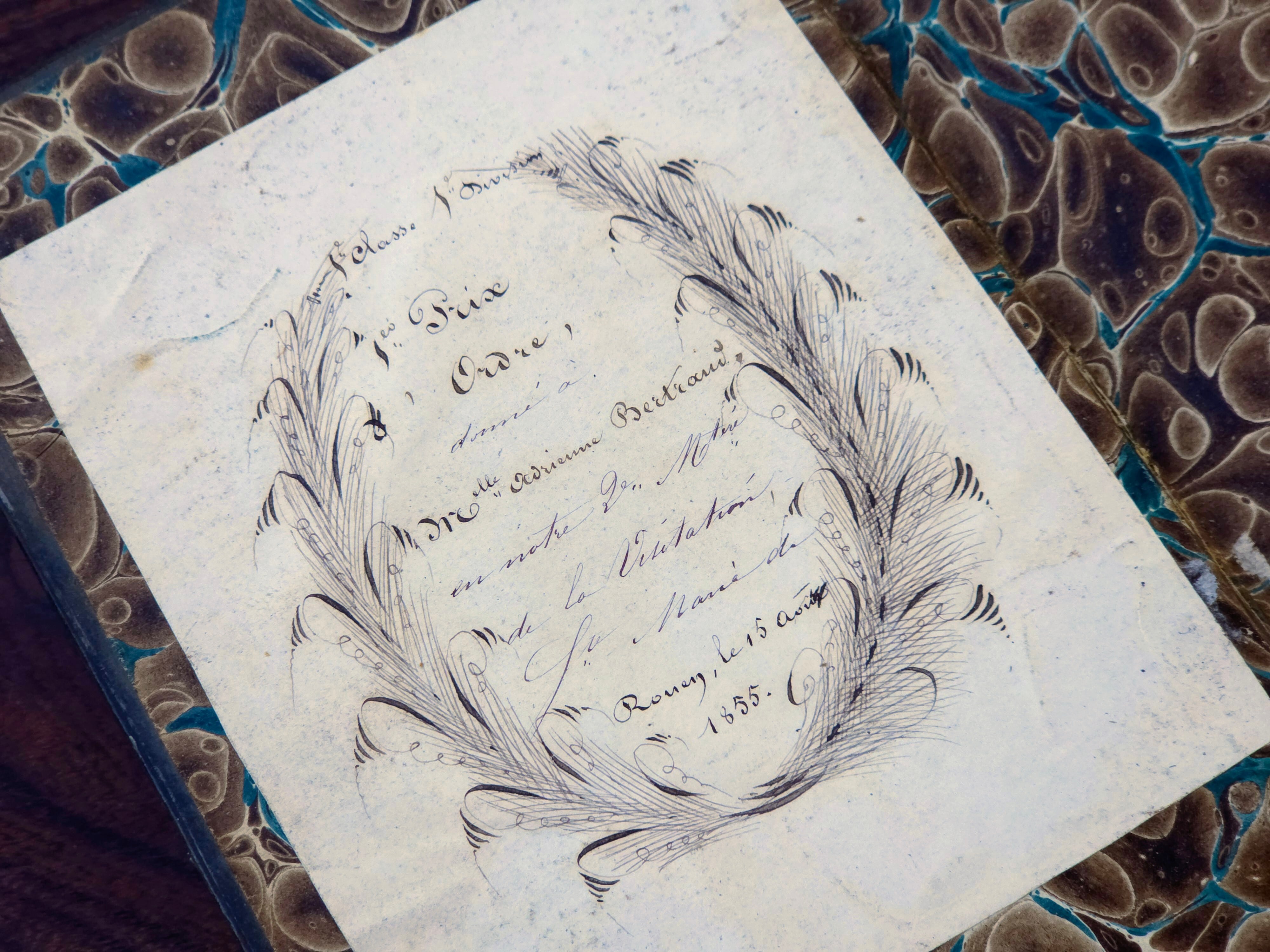 裏表紙に素敵な装飾のラベルが貼られておりこちらにも1855年の記載があります。