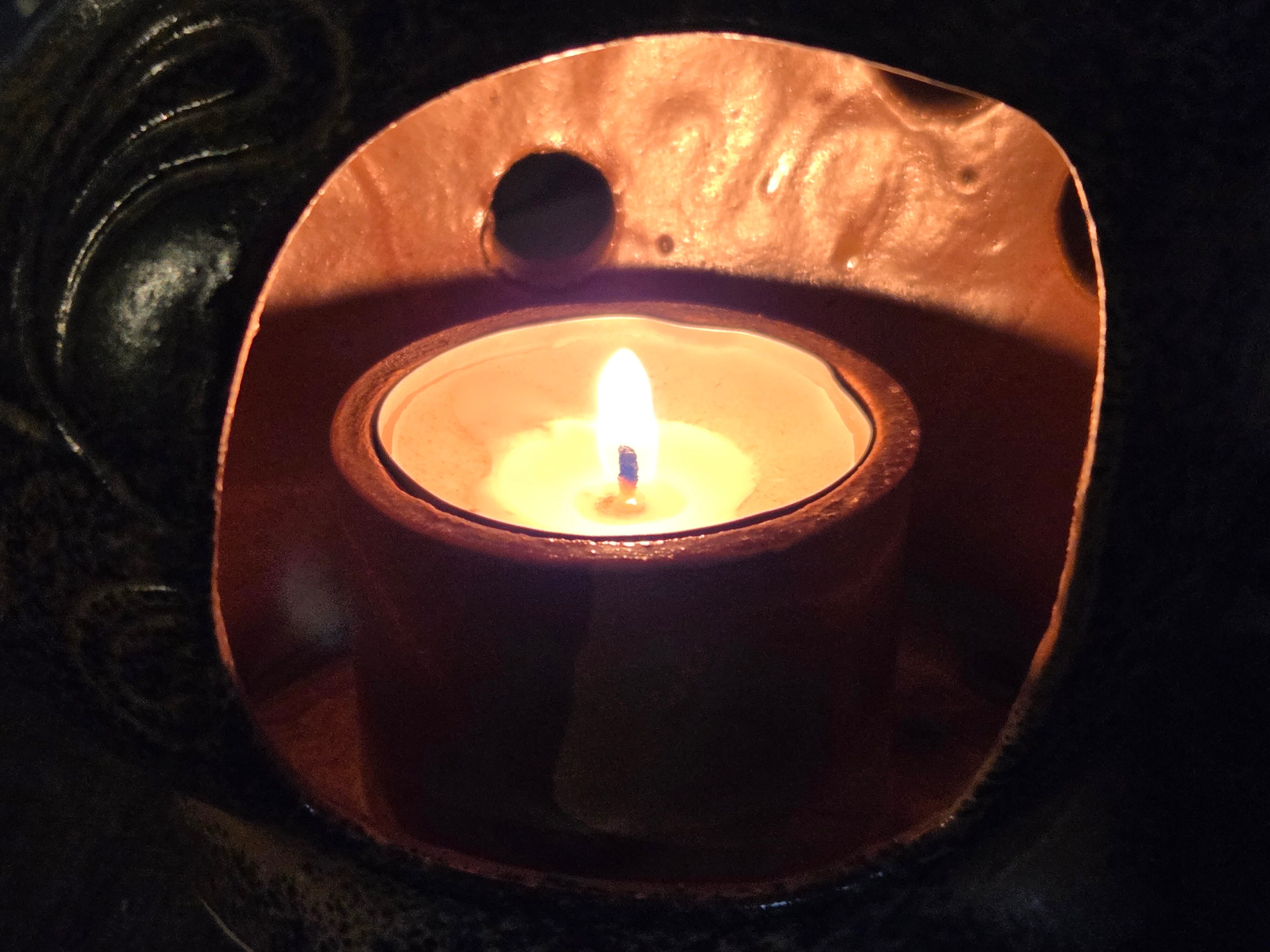 キャンドルを点けると眼と数か所の穴から灯りがフワッと漏れて素敵です。