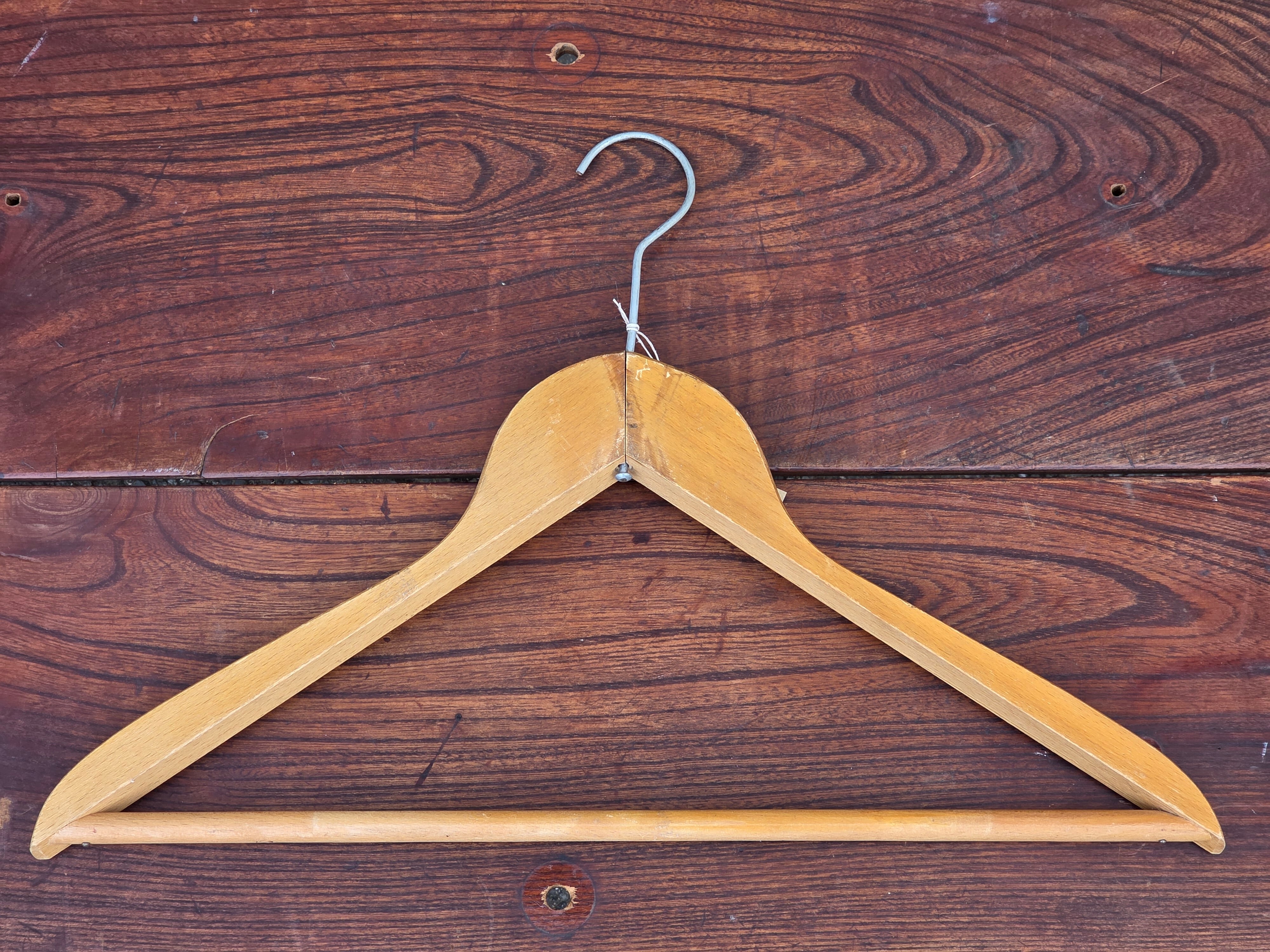 ロンドンのテーラーのネームプレートがついたビンテージ木製ハンガー。