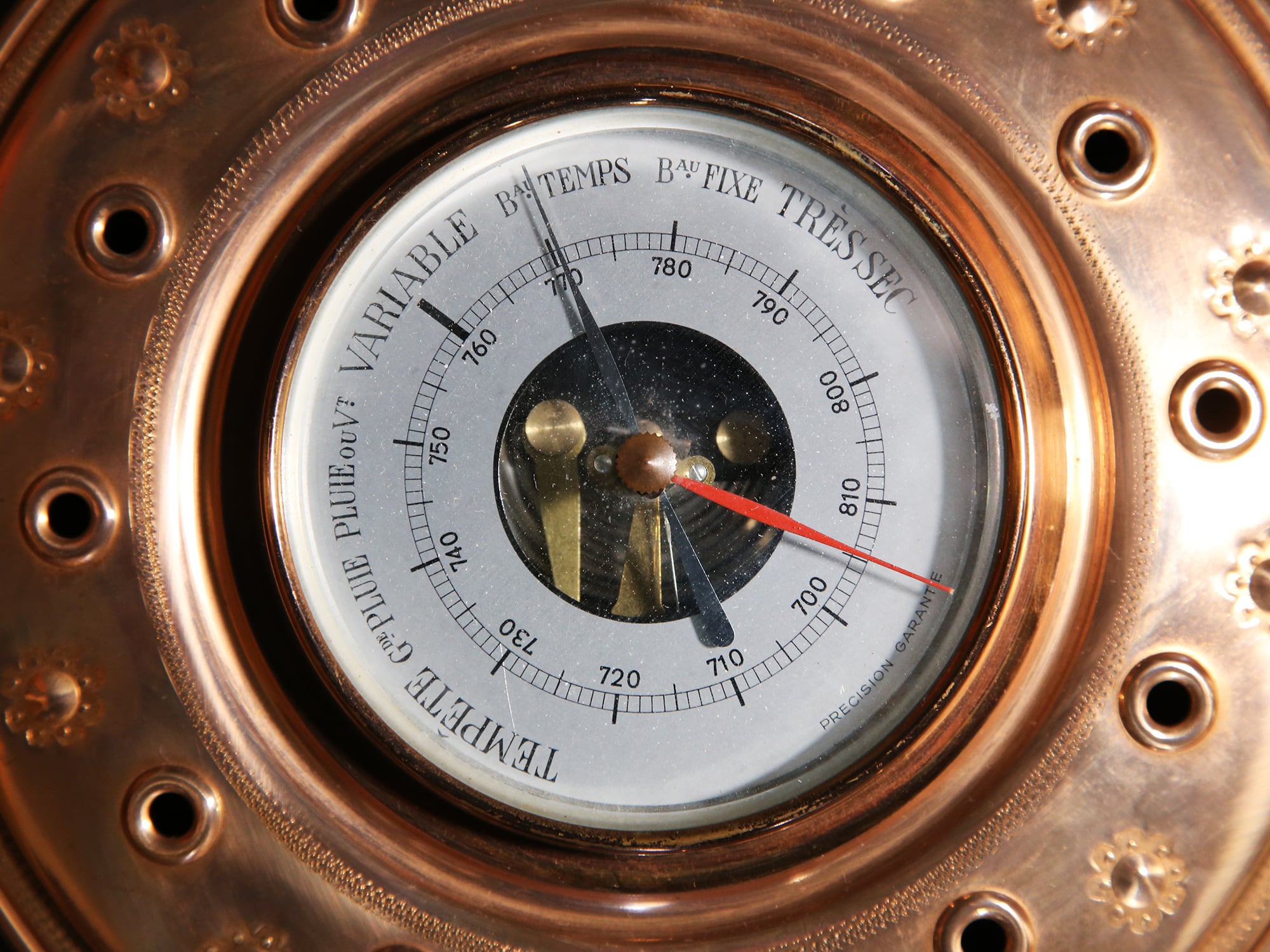 コッパーカラーと木柄の組み合わせがとてもクラシカルな気圧計。