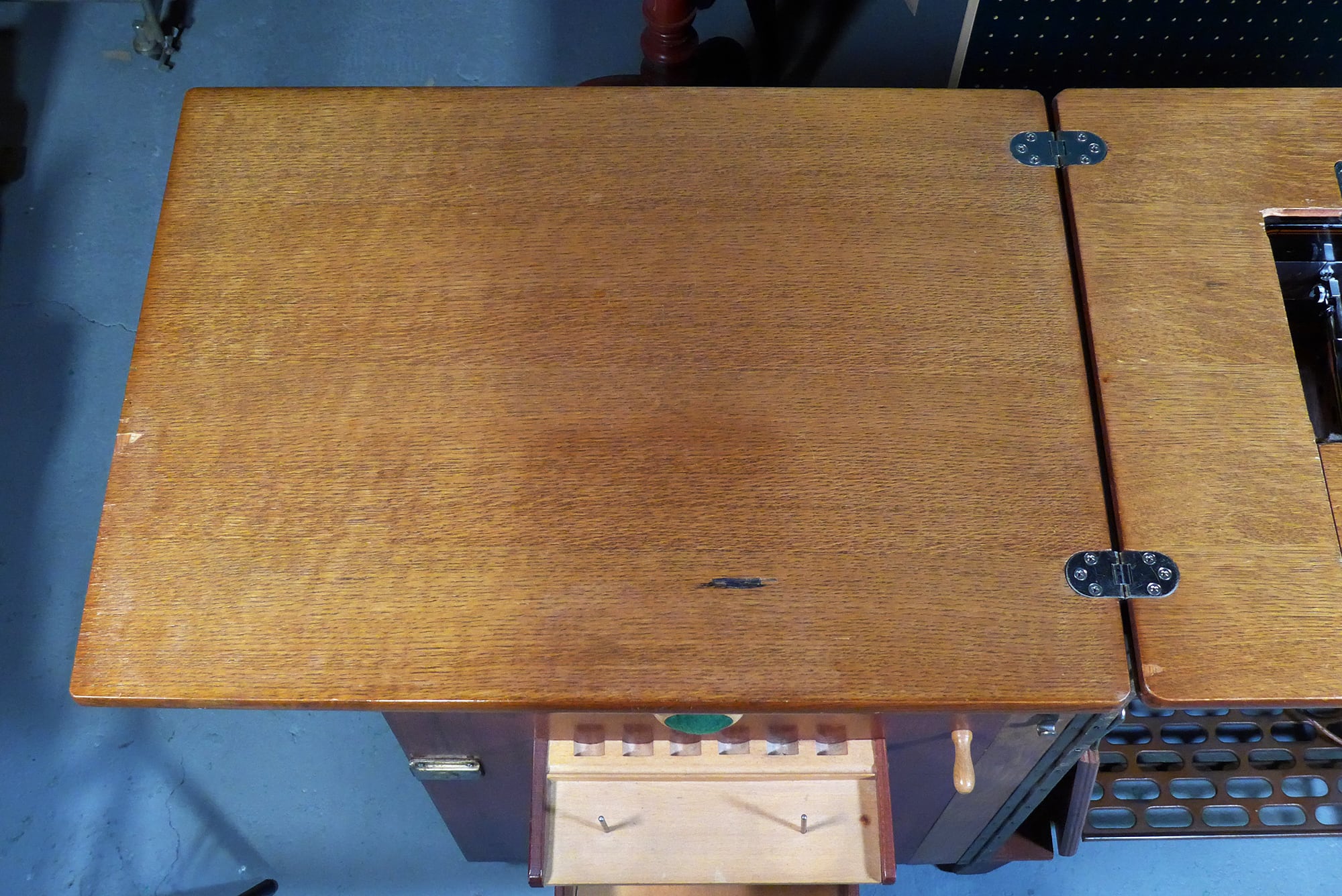 使用時は天板を跳ね上げて、開けた前扉の上に置きます。収納されたミシンを引き上げてすぐに使えるようになります。収納時はコンパクトになります。