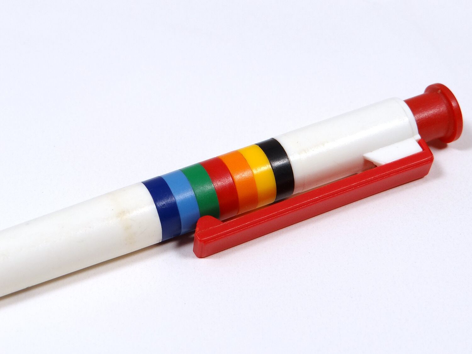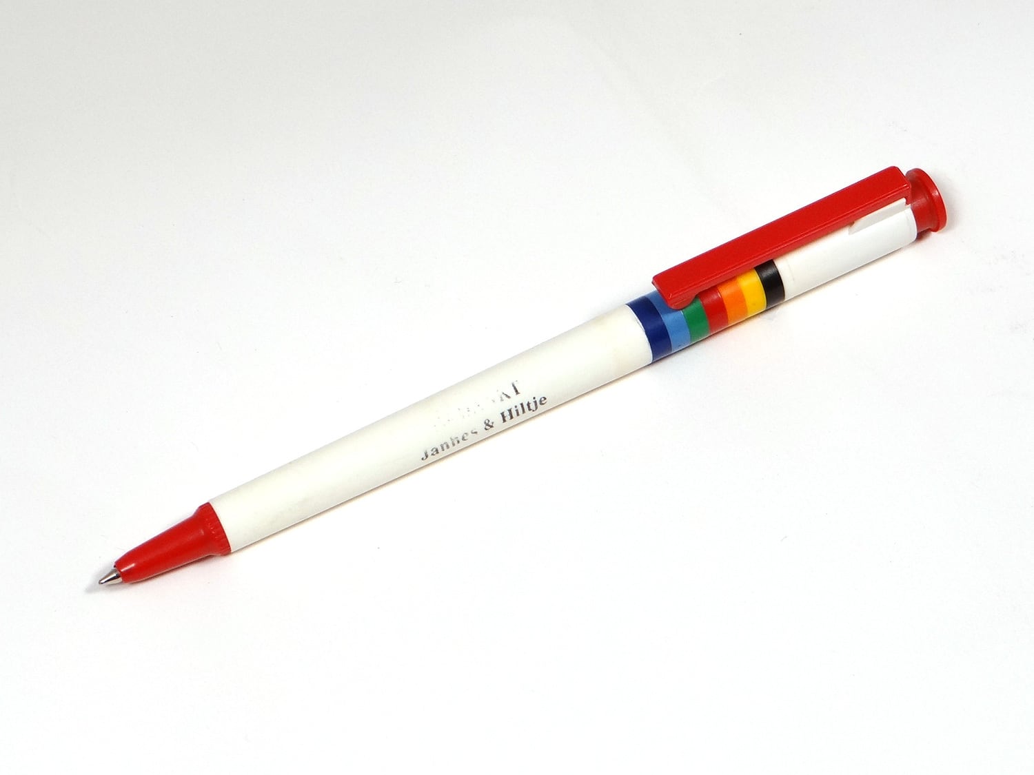 オランダの広告ボールペン。プリントが消えかかっていますが”Janhes & Hiltje”の文字が読めます。カラフルでPOPなボールペンです。